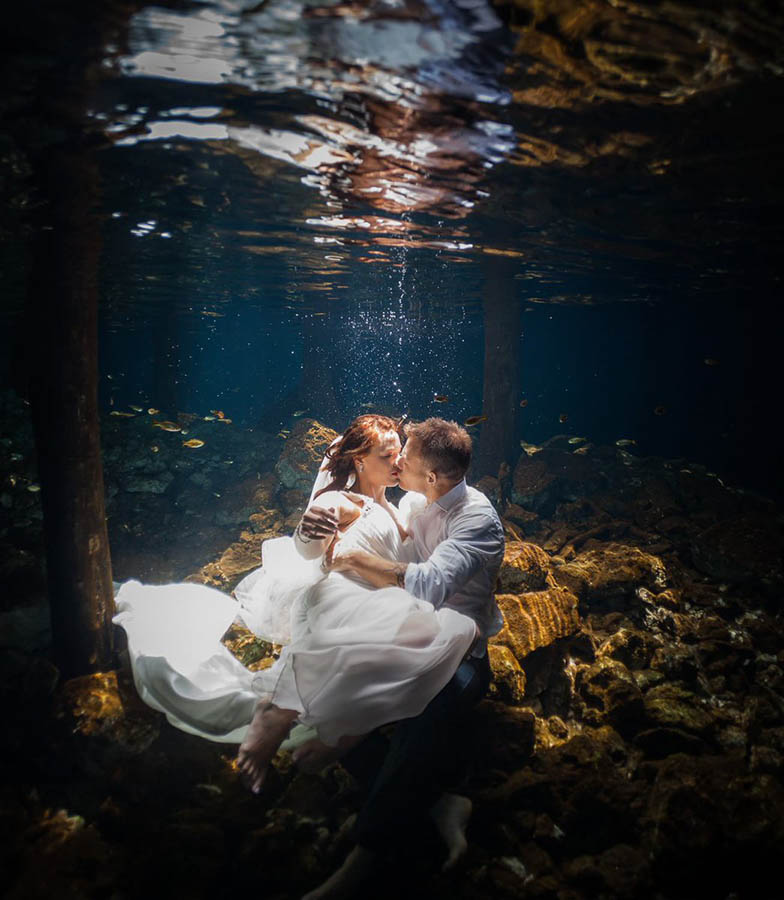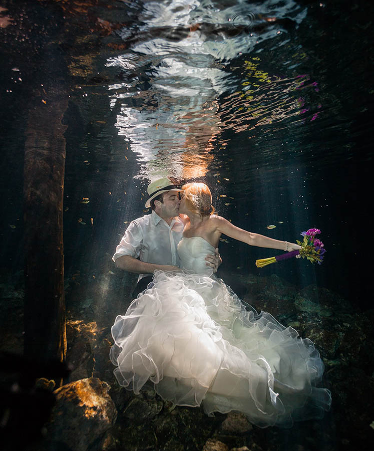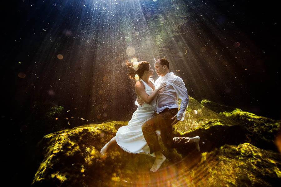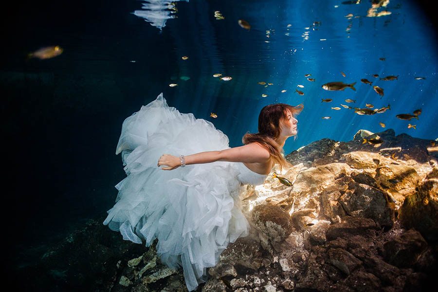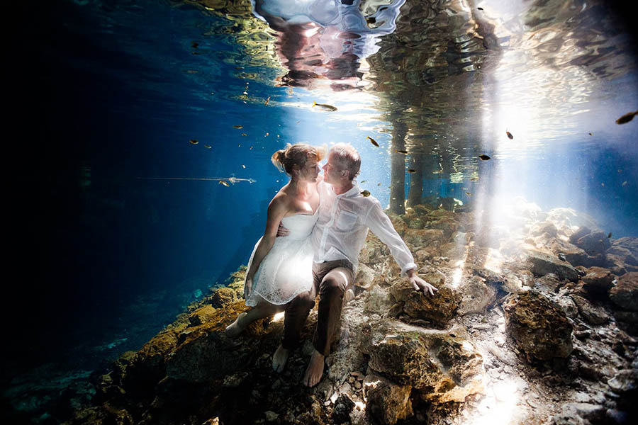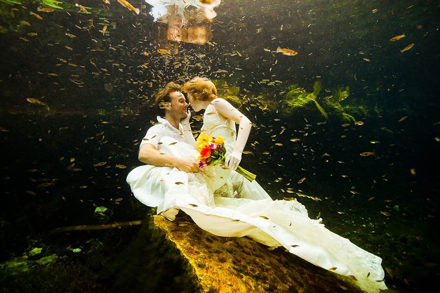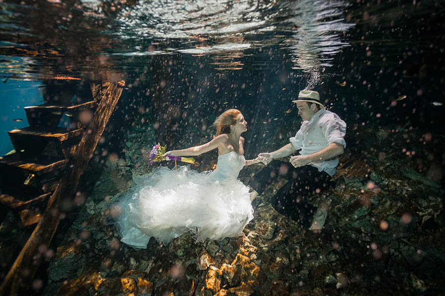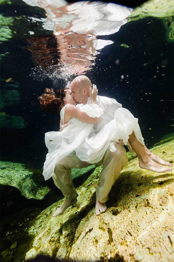 Naime, talentirani fotograf Dean Sanderson sa zainteresiranim parovima snima “trash the dress” – fotografska snimanja s podvodnim motivima parova. Sanderson, inače Kanađanin, ova snimanja radi na Rivieri Maya, turističkoj destinaciji u Meksiku, točnije u lokalnim cenotama punim svježe slatke vode. Cenote su stare majanske civilizacija opskrbljivali vodom za piće, a priča se da sadrže posebne energije.