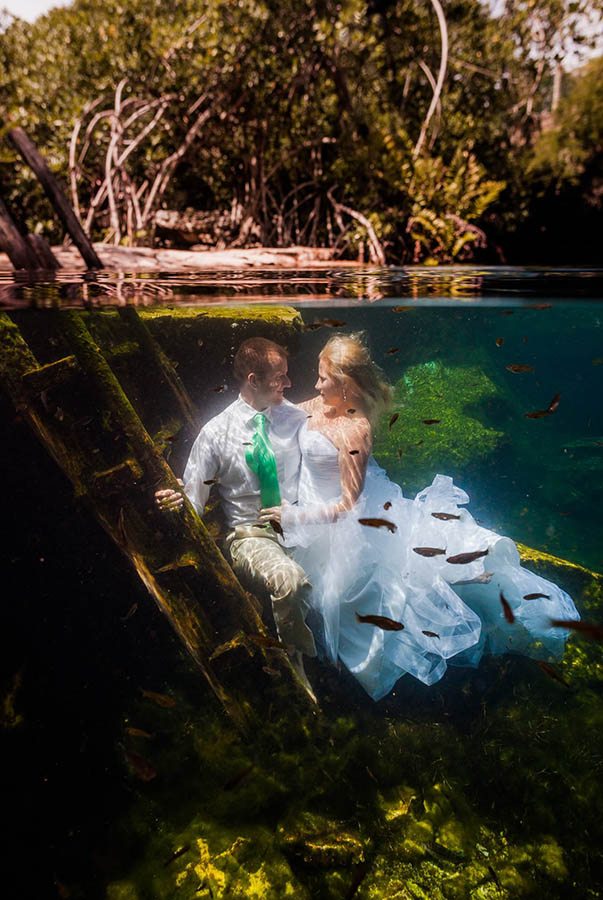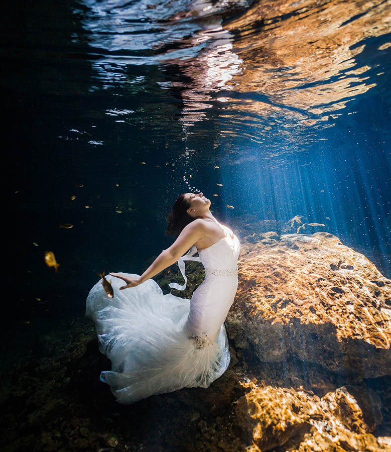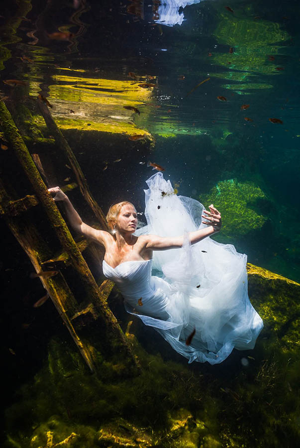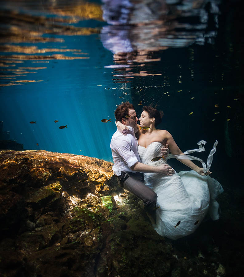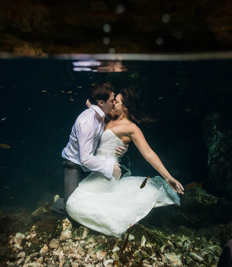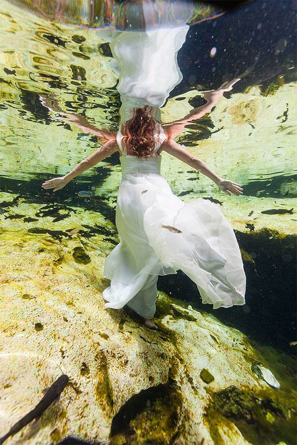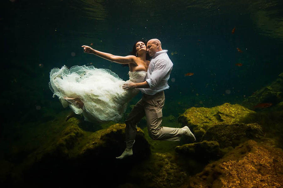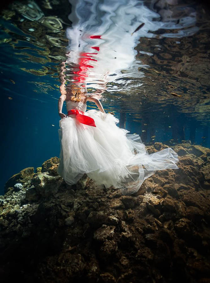 Naime, talentirani fotograf Dean Sanderson sa zainteresiranim parovima snima “trash the dress” – fotografska snimanja s podvodnim motivima parova. Sanderson, inače Kanađanin, ova snimanja radi na Rivieri Maya, turističkoj destinaciji u Meksiku, točnije u lokalnim cenotama punim svježe slatke vode. Cenote su stare majanske civilizacija opskrbljivali vodom za piće, a priča se da sadrže posebne energije.