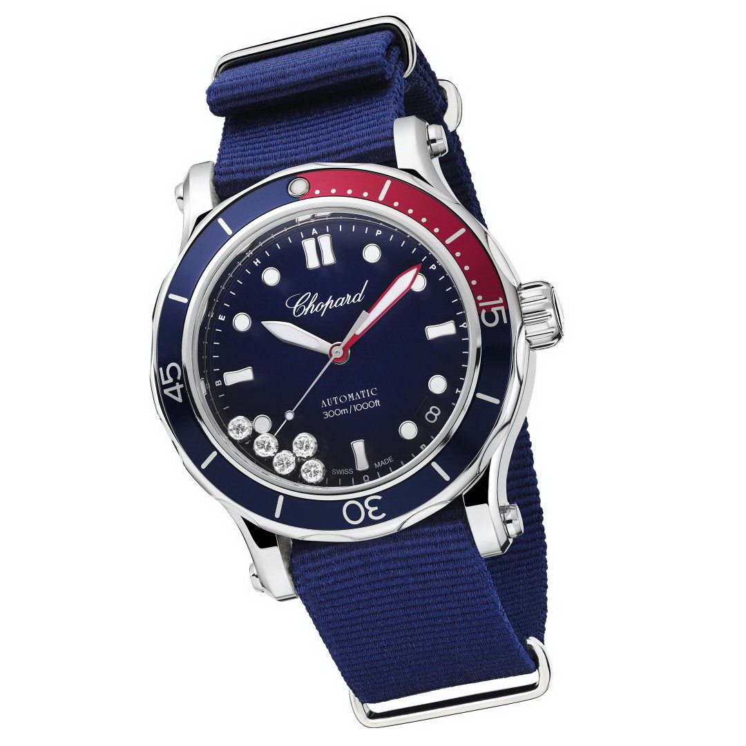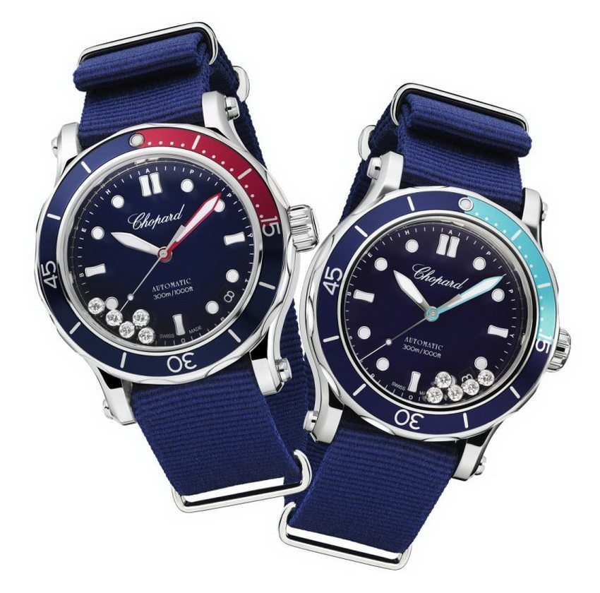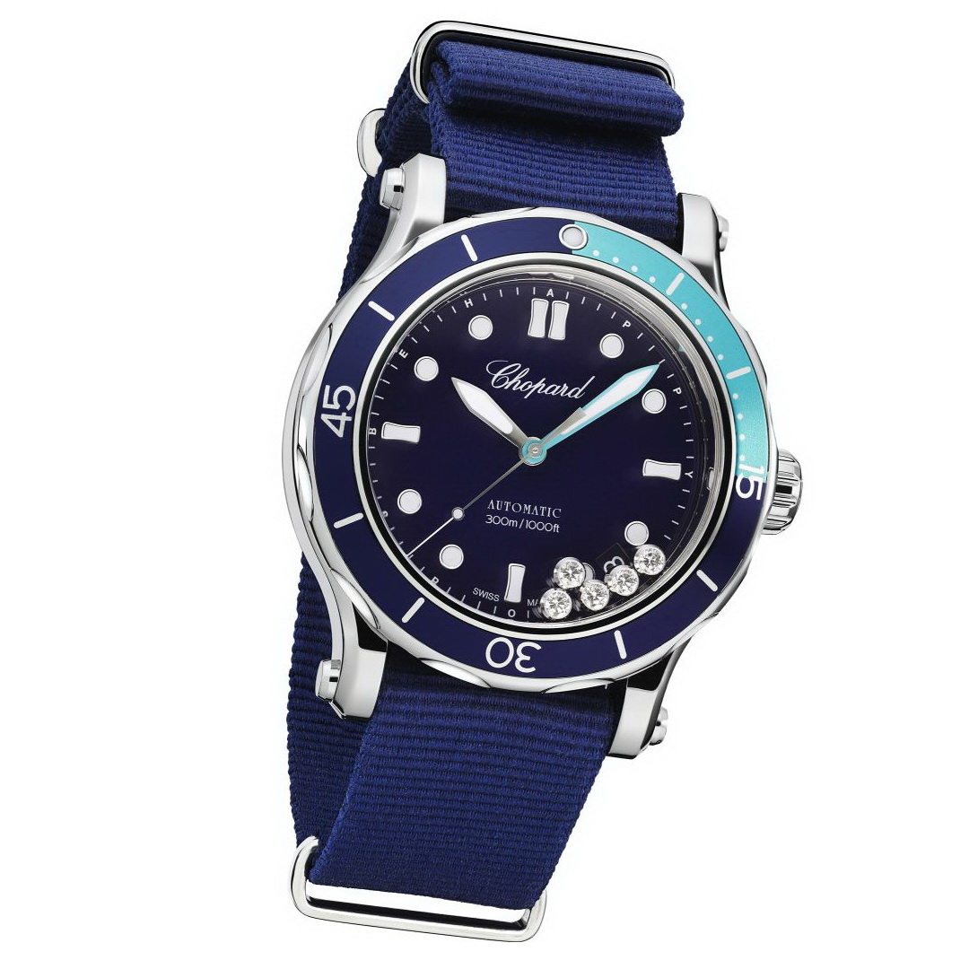 Prekrasno, visoko polirano čelično kućište promjera je 40 milimetara i debljine 13,6 milimetara, a na poleđini je ugraviran motiv valova. Jednosmjerno rotirajući ronilački prsten moguće je birati u dvije varijante, s detaljem u tirkizno plavoj ili boji maline. Brojčanik i ostale tri četvrtine ronilačkog prstena te 20 milimetara široka Nato narukvica tamno su plave boje, s tim da se polirana, čelična ronilačka kopča na narukvici savršeno podudara s kućištem sata. Mehanizam koji pogoni Happy Ocean Diver samonavijajući je Chopard caliber 01.01-C s rezervom snage od čak 60 sati, a prikazuje sate, minute, sekunde i datum. Naravno, za zaljubljenice u podmorje važan podatak je i vidljivost oznaka na brojčaniku, kazaljkama i ronilačkom prstenu, a za to je zadužen švicarski SuperLuminova premaz koji ih čini jasnim i u najvećim dubinama. Vodootpornost ovog modela zajamčena je do 300 metara dubine, a spomenuti dijamanti utješno svjetlucaju u tami oceanskih bespuća.