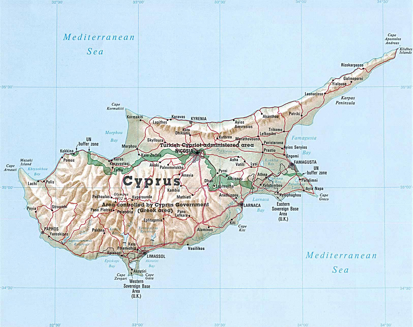 Cipar, koji je od turske invazije 1975. podijeljen na Republiku Cipar koja zauzima otprilike dvije trećine površine otoka i, osim od Turske potpuno nepriznatu, Tursku Republiku Sjeverni Cipar, podijeljen je granicom čiji prijelaz i danas uz pregled putovnica, bodljikavu žicu, naoružanu vojsku, ničiju zemlju, kružne tokove i ležeće policajce izaziva mučninu i podjelu između dva svijeta koja je svakim danom sve dublja i dublja. I jedna i druga strana kao da ignoriraju činjenicu da na otoku postoji nekakva granica i “oni drugi” pa je nemoguće naći putokaze koji upućuju na granične prijelaze. Do granice se uglavnom dolazi po osjećaju gledajući na kartu i stajući svako malo tražeći po automehaničarskim radionicama, benzinskim pumpama ili restoranima savjete kako doći do granice. Ako želite autom prijeći na drugu stranu, morate kupiti dodatno auto osiguranje jer europsko osiguranje ne vrijedi s druge strane bodljikave žice i obrnuto.