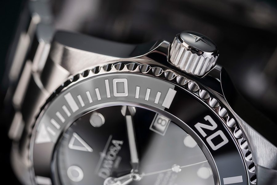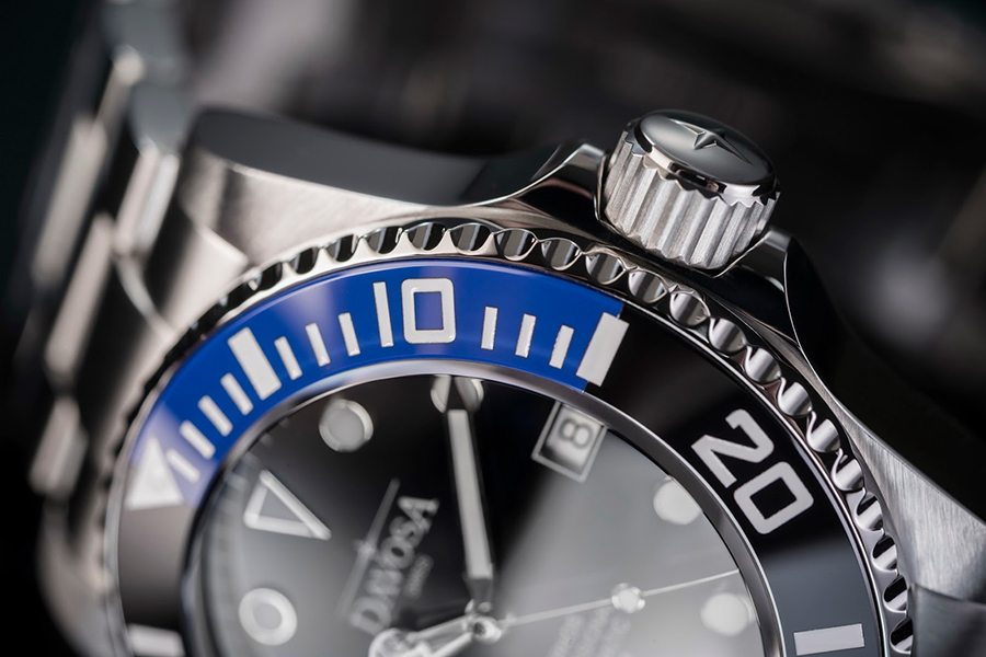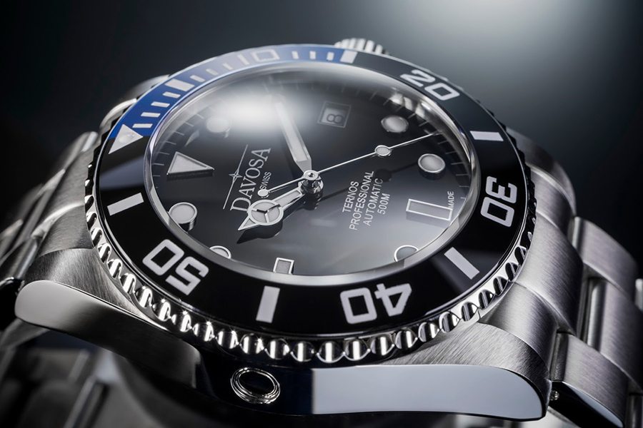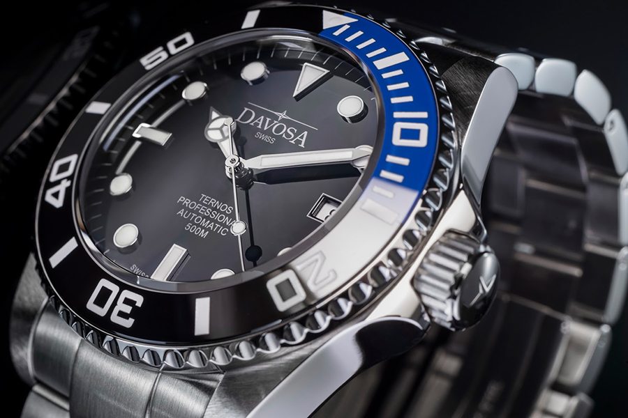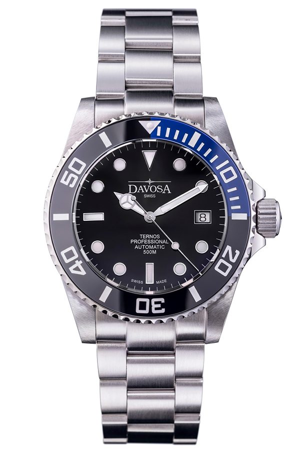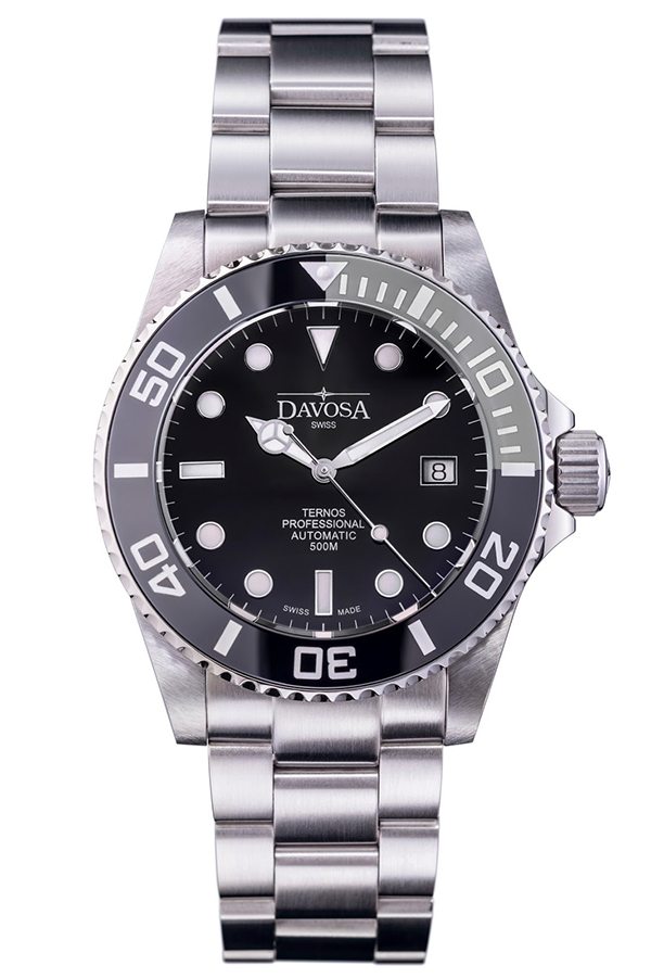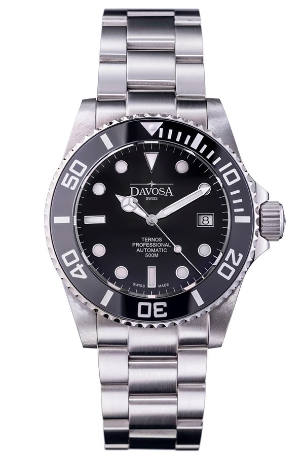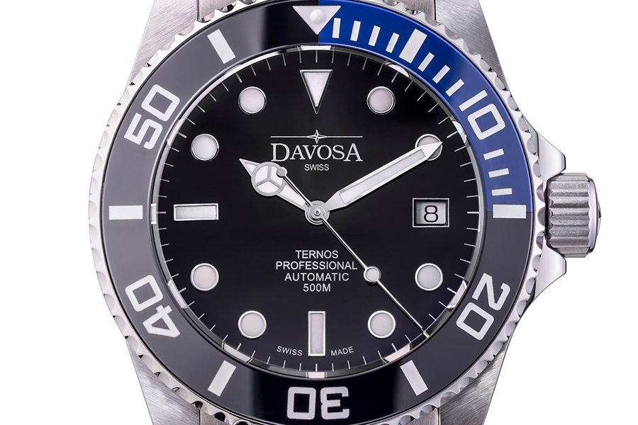 Promjer kućišta od nehrđajućeg čelika je 42 milimetra, što je za današnje trendove pomalo neobično, ali ta tradicija… Jednosmjerno rotirajući ronilački prsten s keramičkim umetcima može biti u kombinaciji crne i plave (“za one malo smjelije”), za one malo konzervativnije tu je varijanta u kombinaciji crne i sive, a dostupna je i opcija za ljubitelje crne – crni ronilački prsten. Mehanizam koji pokreće ovaj sat je samonavijajući DAV2824, što je ustvari provjereni Švicarac SW200 i njegova preciznost je neupitna. Naravno, staklo je safirno, premazano antireflektirajućim premazom, a oznake na brojčaniku i ronilačkom prstenu tretirane su SuperLumiNova premazom pa utješno svijetle u dubini. Kako bi dokazao da je pravi, profesionalni ronilački sat Davosa Ternos Professional TT bočno ima automatski helijski ventil, a vodootpornost je zajamčena do dubokih 500 metara.