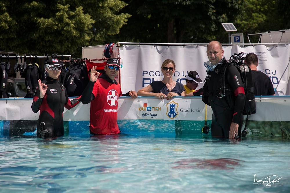 Tijekom dva dana gostovanja u Gradu Pazinu besplatno je zaronilo preko 300 Pazinjana, a ronjenju s punom ronilačkom opremom i uz stručni nadzor instruktora ronjenja pridružio se svojim sugrađanima i gradonačelnik Grada Pazina, Renato Krulčić koji je sa zadovoljstvom zaronio na glavnom gradskom trgu. “Pazinjani vole vodu kroz Pazinsku jamu koja je povezana s morem, a svega smo 20 minuta od istočne i zapadne obale. Ronjenje je posebno iskustvo, mir i tišina, jedan sasvim drugi svijet gdje se može uživati u ljepotama ronjenja i izuzetno nam je drago što “Pogled u plavo”gostuje u Pazinu te što Pazinjani mogu osjetiti čari i ljepote ronjenja. Ovdje su ronila i djeca vrtićke dobi, a oni koji nisu bili dovoljno hrabri da zarone, imali su edukativne radionice o sigurnosti na moru i pod morem. Sretni smo što ovdje u sklopu projekta Pogled u plavo osim Pazinjana rone i djeca iz Zagreba koja će proći osnovne tehnike ronjenja kako bi zajedno s djecom iz Slovenije čistili hrvatsko podmorje u Savudriji tijekom ovog vikenda”, istaknuo je Renato Krulčić, gradonačelnik Grada Pazina.