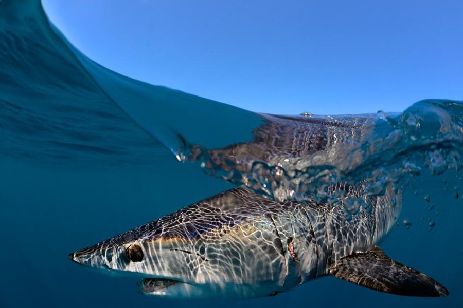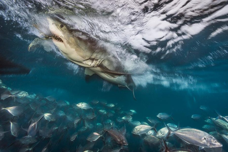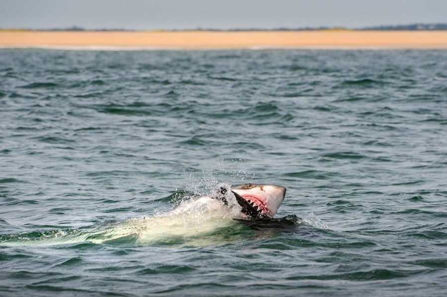 Fotografija je to koja prikazuje veliku bijelu psinu kako iskače iz mora. Osoba koja se predstavila kao Bob Burton objavila je atraktivnu, ali očito lažnu sliku.