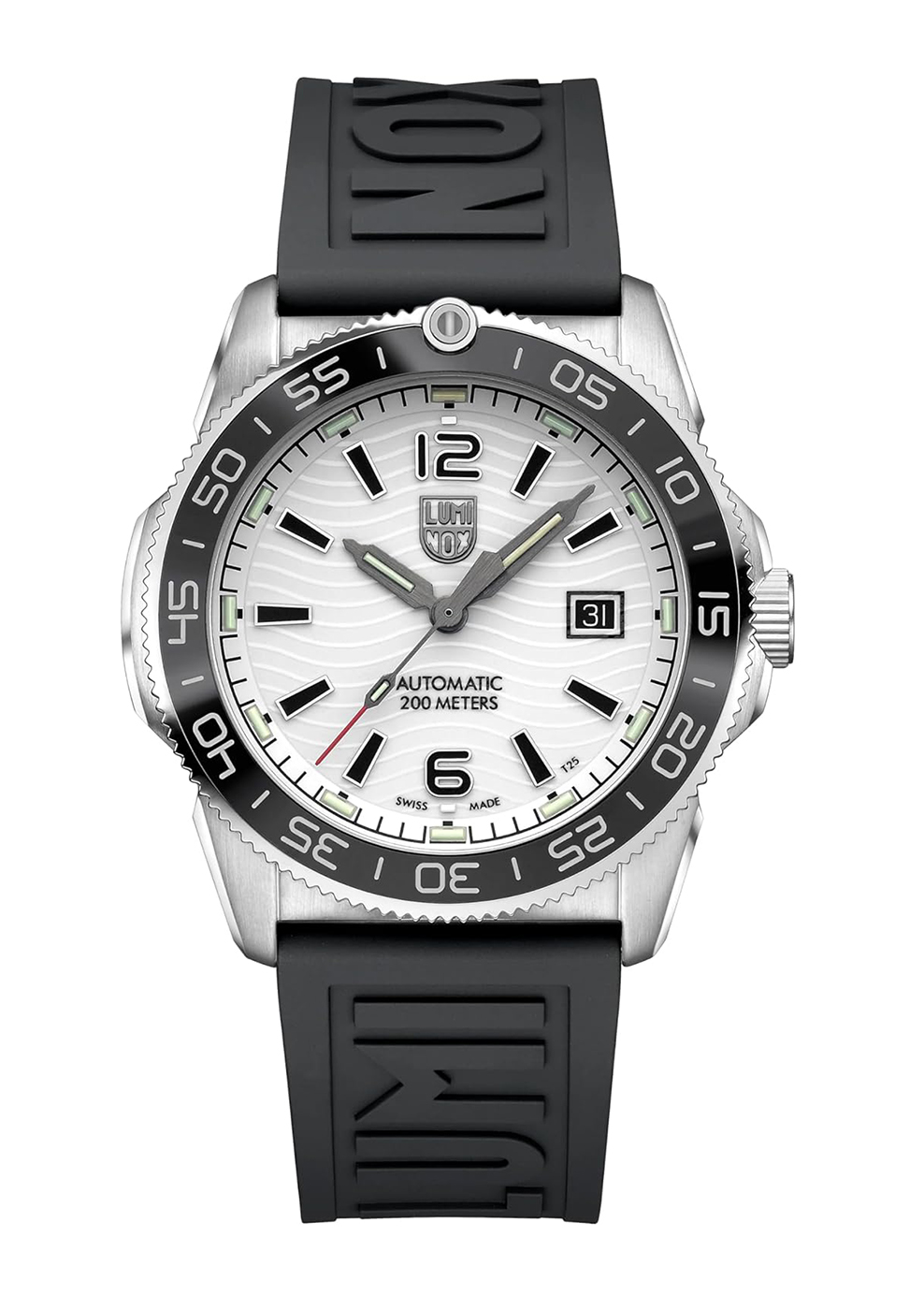 Kontrastna crno-bijela shema boja brojčanika olakšava čitanje tijekom dana i uključuje teksturirani uzorak valova koji nije odmah vidljiv kad se sat gleda izravno, ali hvata svjetlost pod kutom za suptilan, elegantan ukras. Jednosmjerno rotirajući ronilački okvir za mjerenje proteklog vremena je niskog profila, ali jednostavan za korištenje te je potpuno graduiran s markerima postavljenim u intervalima od pet minuta, što omogućuje lako i precizno praćenje kratkog i dugog trajanja.