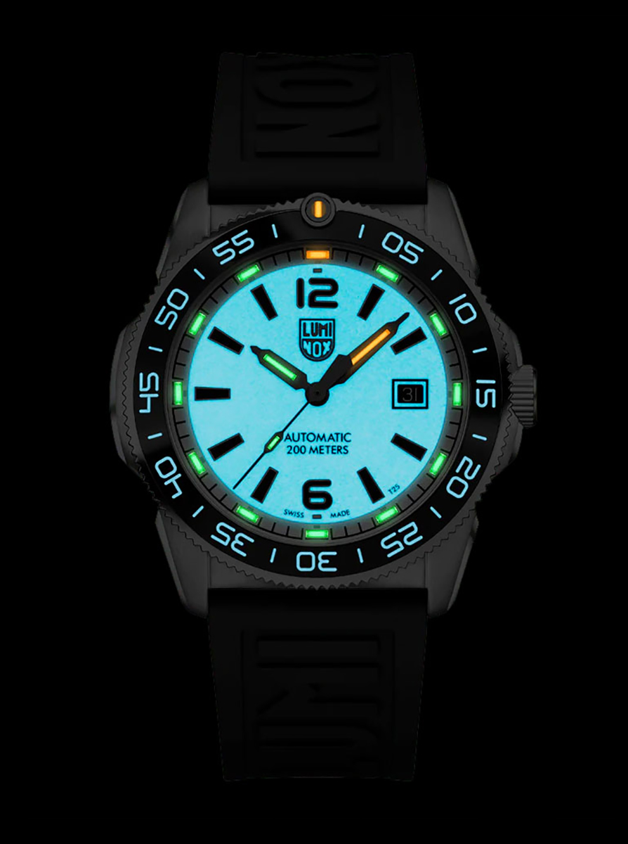 Uz prepoznatljivu luminescentnu tehnologiju tvrtke, sat ima SuperLumiNova premaz na brojčaniku i indeksima na okviru. Nakon što se “napuni” odgovarajućim izlaganjem prirodnom ili umjetnom svjetlu i aktivira u mraku, ovaj premaz daje vodeni sjaj koji je svijetao i nepogrešiv. Možda se čini pomalo suvišnim, ali to je više od samo zgodnog trika za zabavu. Osim prozorčića s datumom, brojčanik i okvir mogu se čitati kao da su na dnevnom svjetlu, što korisnicima omogućuje da iskoriste čist, kontrastan prikaz i potpuno graduiranu lunetu sata čak i kada se svjetla ugase.