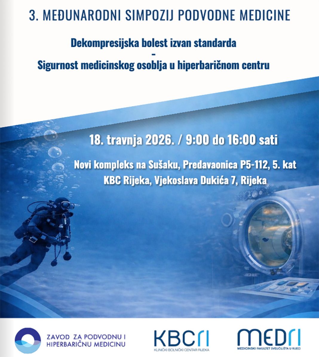 U Rijeci će se 18.4.2026. održati 3. Međunarodni simpozij podvodne medicine u organizaciji Zavoda za podvodnu i hiperbaričnu medicinu KBC Rijeka i Centra za istraživanja i edukaciju u podvodnoj, hiperbaričnoj i pomorskoj medicini Medicinskog fakulteta u Rijeci.
