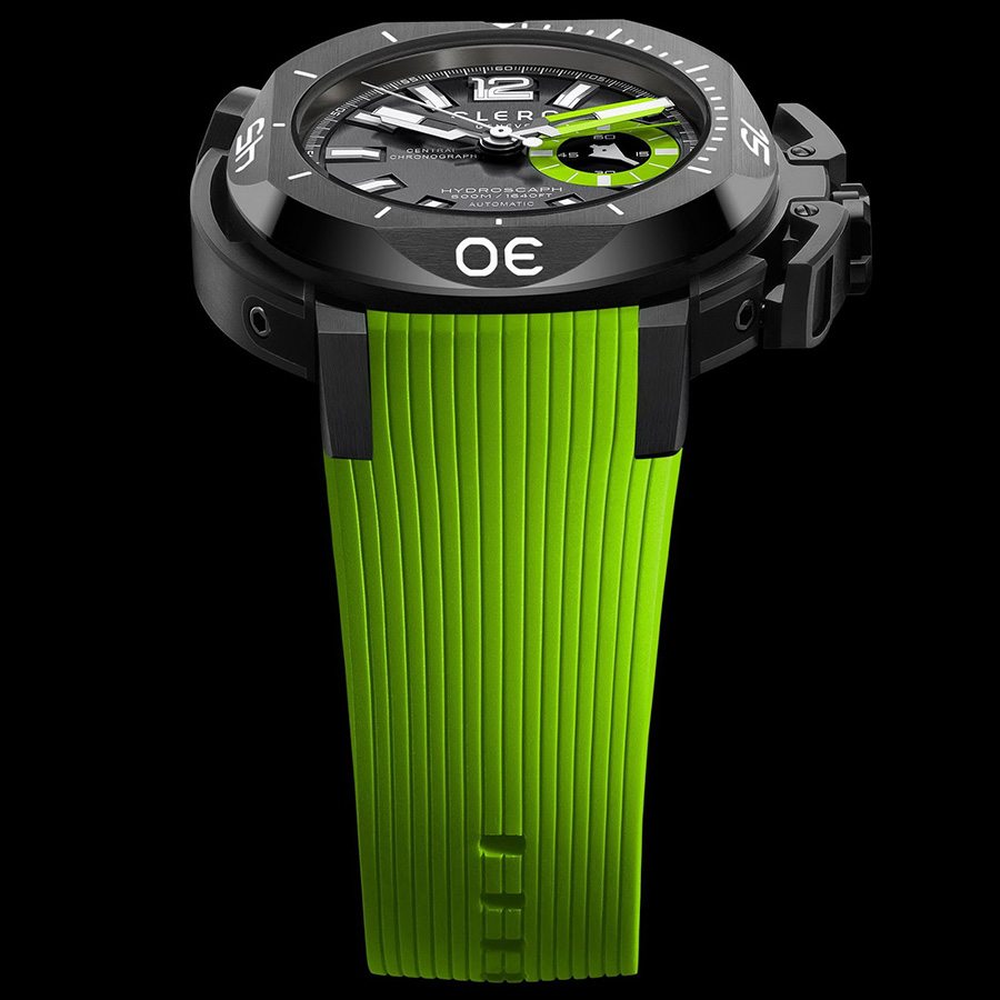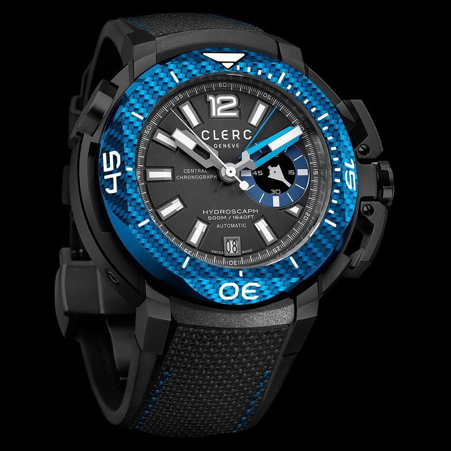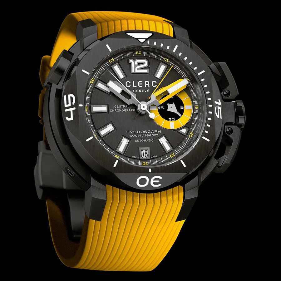 Dizajneri su u novoj ronilačkoj sezoni odlučili vrhunskom primjerku urarske tehnologije udahnuti svježinu. Tako su predstavljeni plavo-crni, žuti i zeleni model Clerc Hydroscaph Central Chronographa. Prepoznatljiv oblik kućišta “savršenog kvadrata u savršenom krugu” obogaćen je novim bojama i ima posebnu draž, a materijal kućišta, nehrđajući čelik presvučen crnim zaštitnim premazom, ističe obojene dijelove. Inače, već i samo kućište ovog sata posebna je priča. Konstruirano je od 103 dijela, a promjer je 43.88 milimetara. Vidljivost brojčanika u sve tri varijante odlična je i u mraku, a trodimenzionalne oznake sati posebno dolaze do izražaja upravo u dubini. Ronilački prsten ima i posebno patentirani sustav zaključavanja na bočnoj strani kućišta koji onemogućuje nehotično pomicanje, a u varijanti s plavom bojom prsten je dodatno naglašen plavim karbonskim vlaknima. Pogled kroz antireflektirajuće safirno staklo otkriva središnji kronograf, minute, sekunde i datum, a mehanizam koji sve to pokreće provjereni je Clerc exclusive C608-2 Caliber s rezervom snage od 44 sata. Narukvica je od vulkanizirane gume, a ovisno o modelu može biti crna s plavim prošavom, zelena ili žuta.