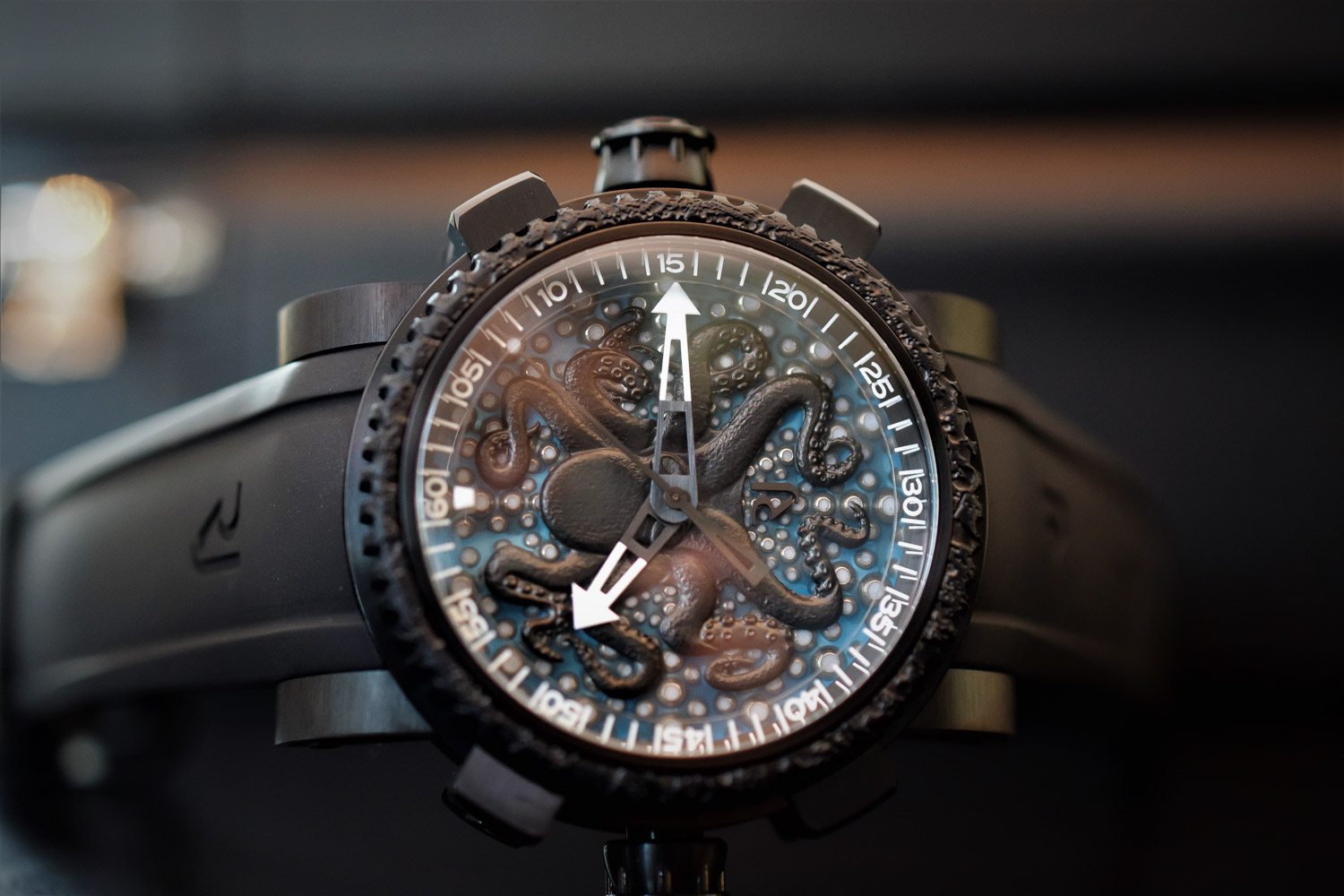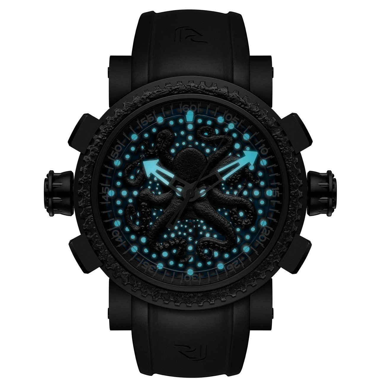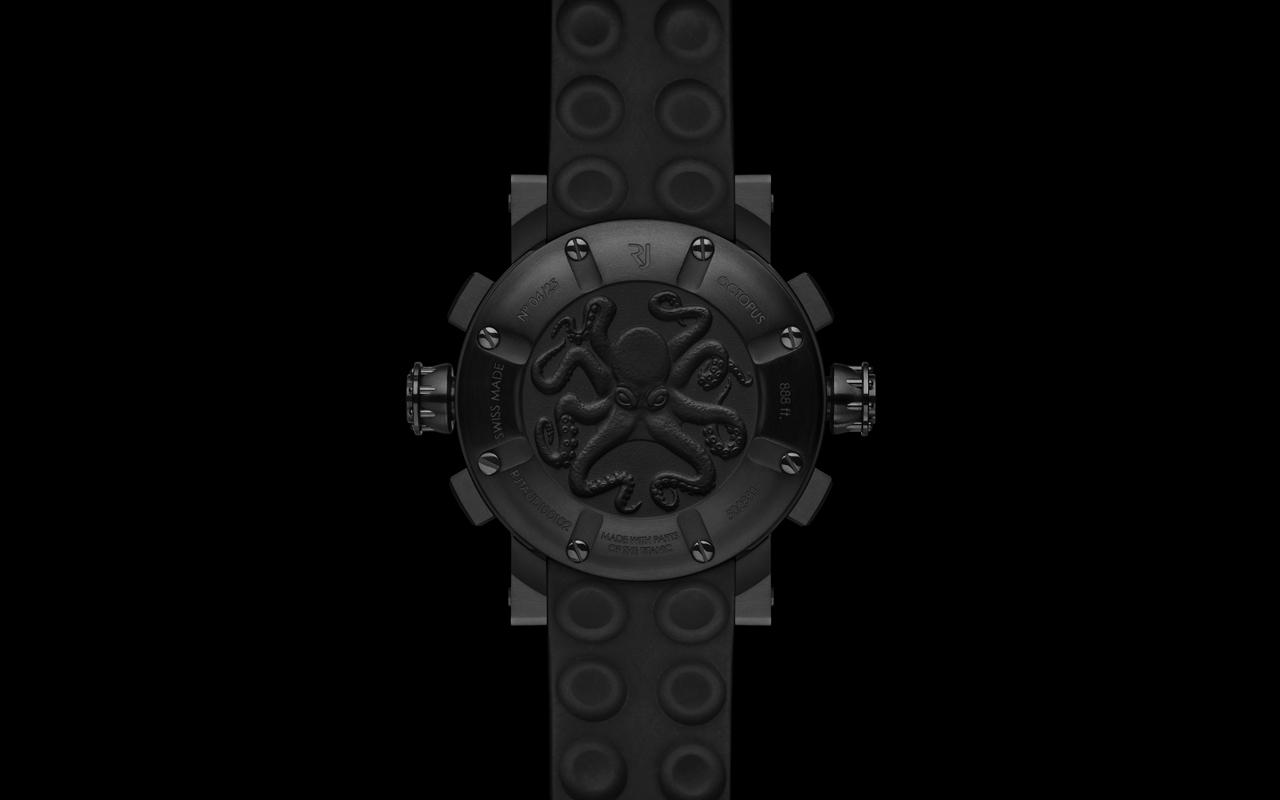 Kako bi ekskluzivnost modela bila zaista zajamčena Romain Jerome Deep Blue Octopus proizveden je u ograničenoj seriji od samo 25 primjeraka. Naravno, poklonike ovog brenda ne treba posebno uvjeravati u vrhunsku kvalitetu i preciznost izrade, a ostali i onako neće previše pažnje posvetiti ovom ekstravagantnom ronilačkom instrumentu. Naime, gotovo je nemoguće imati ovaj sat na ruci i ne privući pažnju, kako pod vodom, tako i na suhom. Bogato ukrašeno kućište tretirano crnim DLC premazom promjera je 47 milimetara, što je samo po sebi dovoljno da privuče pažnju. Krunice za namještanje vremena (na lijevoj strani) i pomicanje unutarnjeg ronilačkog prstena (na desnoj strani) elementi su kojima se naglašava nametljiva priroda ovog sata. Pogledamo li brojčanik, uočit ćemo istaknuti reljef hobotnice okružen mjehurićima svijetlo plave boje. Oči hobotnice, kao i ostali mjehurići na brojčaniku, kazaljke i oznake sata tretirani su SuperLuminova premazom pa pogled na brojčanik u mraku predstavlja pravi praznik za oči ljubiteljima ovakvog stila. Staklo je safirno, antireflektirajuće, a mehanizam koji se krije u kućištu je samonavijajući RJ002-A2 calibre s rezervom snage od 42 sata. Naravno, na poleđini je također gravura hobotnice, a poklopac je pričvršćen s osam vijaka. Zgodno je primijetiti kako je i svaka krunica ukrašena s osam zakovica, hobotnice imaju osam krakova, a vodootpornost ovog sata zajamčena je do 888 stopa dubine (do 270 metara). Da je ovaj sat zaista dosljedan zadanoj temi ronjenje – dubine – hobotnice dokaz je i gumena narukvica koja s donje strane ima prianjalke nalik na donji dio krakova hobotnice, a čelik korišten u izradi ronilačkog prstena i okvira na kućištu zapravo je oksidirani i stabilizirani čelik sa slavnog Titanica!