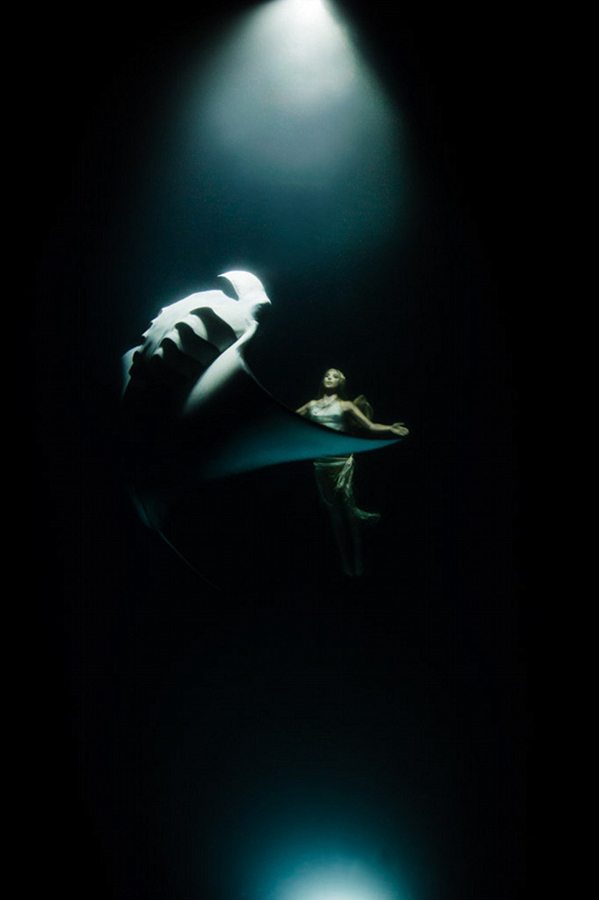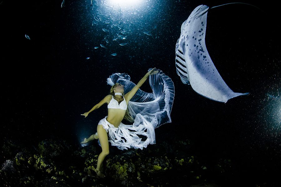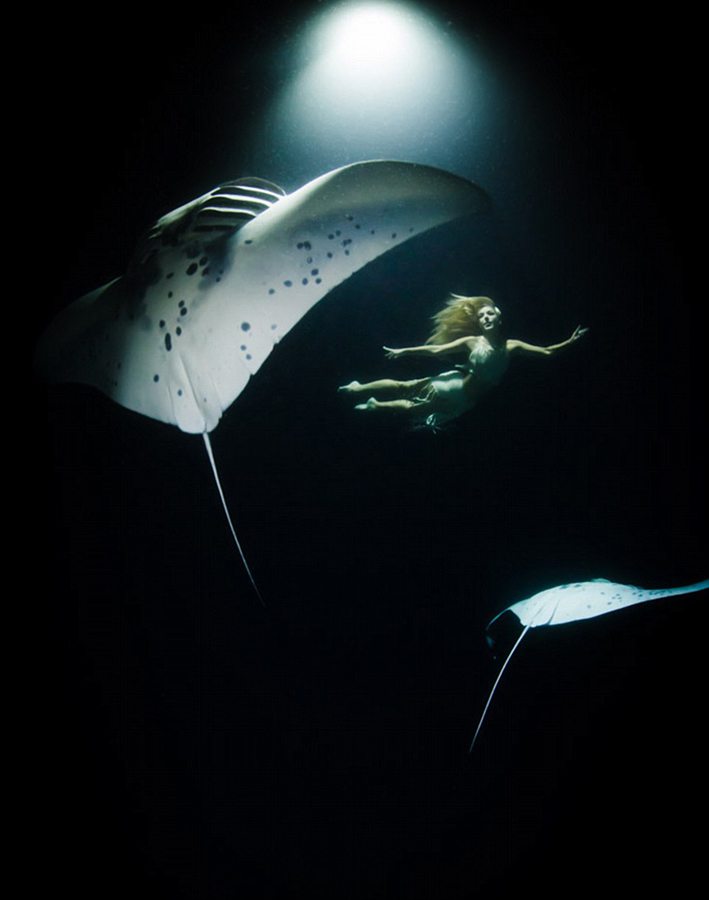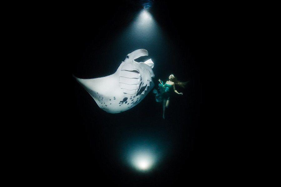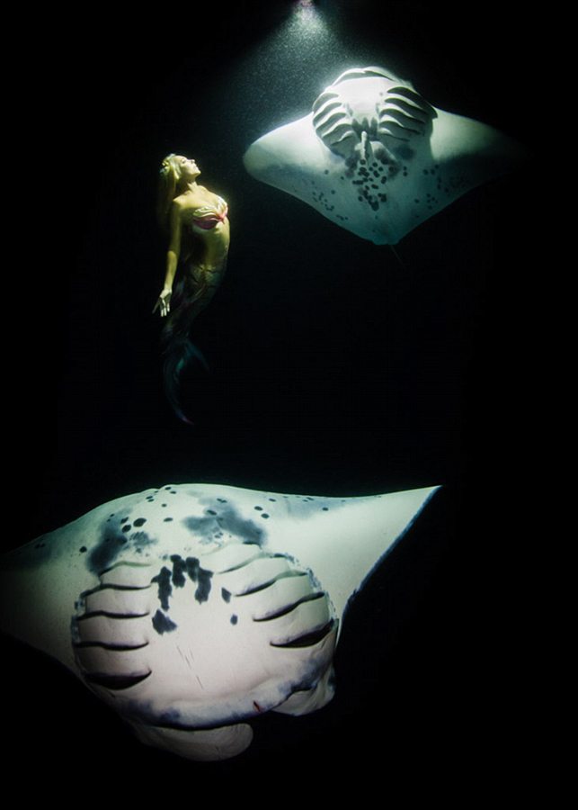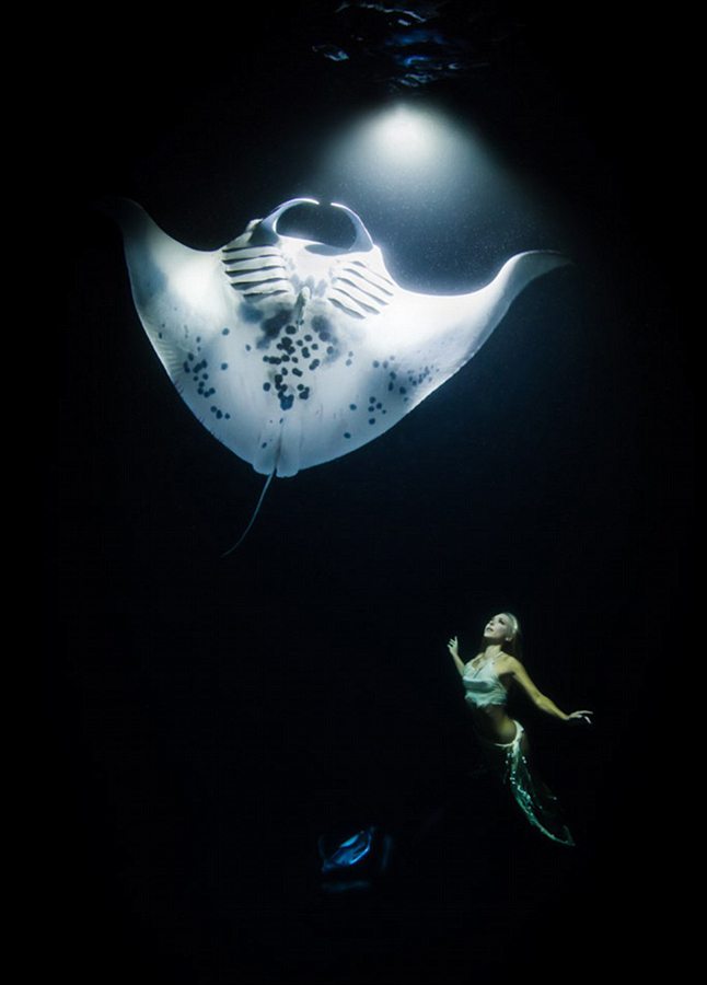 Na njima se vidi model obučena kao sirena u društvu golemih raža, a cilj ovih snimke je podići svijest o ugroženosti ovih životinja kojima prijeti izumiranje. 45-godišnji fotograf za modela je odabrao Hannah Fraser, a noćno snimanje je obavljeno u vodama Havaja. Ideja je da se ljude osvijesti o osjetljivosti morskoga života, odnosno ugroženosti vrsta kao što su raže, morski psi, delfini i kitovi. Shawn i Hannah su prije tri godine snimili i kratki film “Posljednji ples manti”, a sada je na red došla serija fotografija napravljenih u vodama Kone.