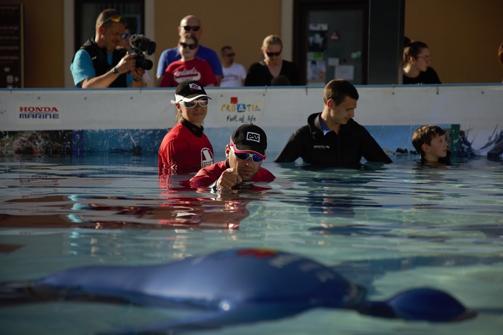 Svim posjetiteljima projekta Pogled u plavo tijekom dva bili su na raspolaganju instruktori ronjenja Nemo-Adria Rescue Teama koji članovi volonteri Specijalističke ronilačke postrojbe za spašavanje iz vode pri Uredu za upravljanje u hitnim situacijama Grada Zagreba i instruktori ronjenja te ronioci Ronilačkog kluba Sisak koji su ih podučavali o osnovnim tehnikama i vještinama ronjenja. “Ronilački klub Sisak ove godine slavi 46 godina postojanja, a u ovom trenutku je jako razvijen i posjećen klub koji ima preko 100 članova. Bavimo se rekreativnim ronjenjem, prvenstveno sportskim ronjenjem, a i podukom o ronjenju. Obučavamo veliki broj djece i mladih koji uče osnove ronjenja, nakon čega se aktivno bave ronjenjem. Pogled u plavo je izvanredan projekt za promociju ronjenja, a posebno u centru grada. Ovdje su i instruktori ronjenja RK Sisak koji su podučavali djecu i mlade osnovnim pravilima ronjenja kako bi mogli uživati u ronjenju”, rekao je Mladen Horvatić, trener instruktor RK Sisak. Osim zarona u 10 metarski bazen posjetitelji su razgledavali podvodnu izložbu fotografija poznatog hrvatskog podvodnog fotografa Marjana Radovića koja se nalazi na unutarnjim stranicama bazena, a pridonosi stvarnom doživljaju dubine. “Bilo je jako lijepo. Ronila sam i prošle godine ovdje i sada se više ne bojim disati pod vodom, super je. Vidjela sam i slike u bazenu. Sviđaju mi se”, rekla je osmogodišnja Lucija. Nakon upoznavanja početnika s tehnikama i vještinama ronjenja, a u sklopu projekta Pogled u plavo, petero volontera okušalo se u ronjenju na dah uz bok Guinnessovom rekordu u ronjenju na dah, Budimiru Šobatu Budi. Budimir Šobat Buda natjecao se u ronjenju na dah protiv udruženih snaga petero volontera koji su pod vodom zajedno uspjeli zadržati dah svega 3,28 minute, dok za Budu to nije predstavljalo problem. Ronjenje na dah protiv petero volontera u Gradu Sisku je bilo u sklopu akcije “Ne dišem” koja ima za cilj promicati svjesnost o autizmu, a u sklopu koje je Buda srušio Guinnessov rekord u statičkom ronjenju na dah krajem veljače, a ujedno podržava projekt Pogled u plavo koji već osmu godinu zaredom neumorno radi na promociji Hrvatske kroz ronjenje, ljepota hrvatskog podmorja i općenito ronjenja kao aktivnosti.