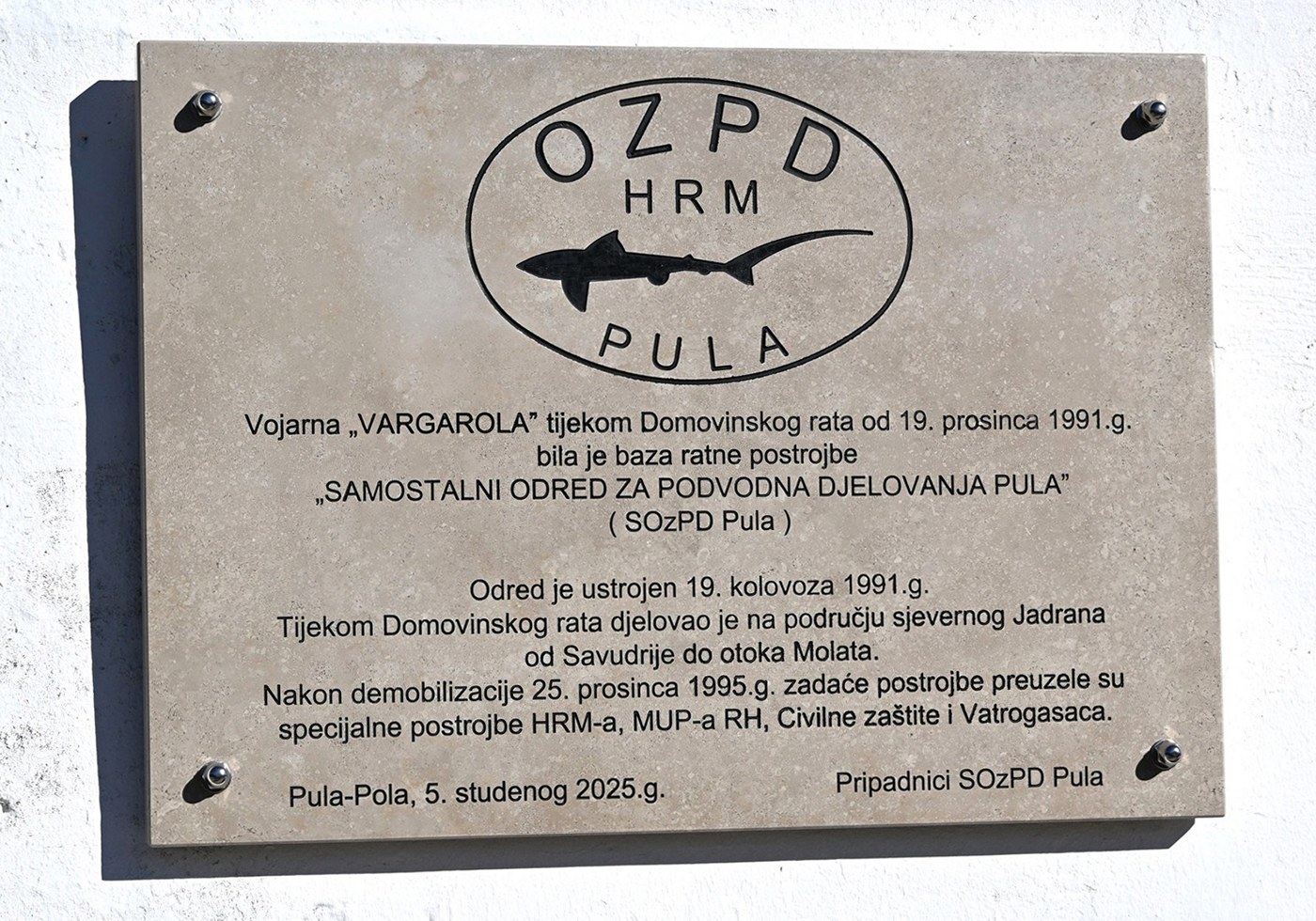U pulskoj vojarni Vargarola prekjučer (5. studenoga 2025.) otkrivena je spomen-ploča Samostalnom odredu za podvodna djelovanja Pula.