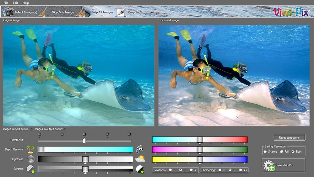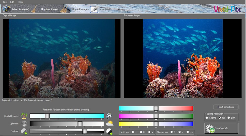 Naravno, program funkcionira i za “kopnene” slike, ali se na podvodnima puno bolje vidi učinak. Korištenje aplikacije je vrlo jednostavno i brzo te se selekcijom odabranih slika nove, uređene slike spremaju u novom folderu nazvanu Vivid-Pix, dok stare ostaju nedirnute kakve jesu. U svakom slučaju, korisna aplikacija koja nije tako kvalitetna kao Photoshop, ali je znatno jeftinija i brža.