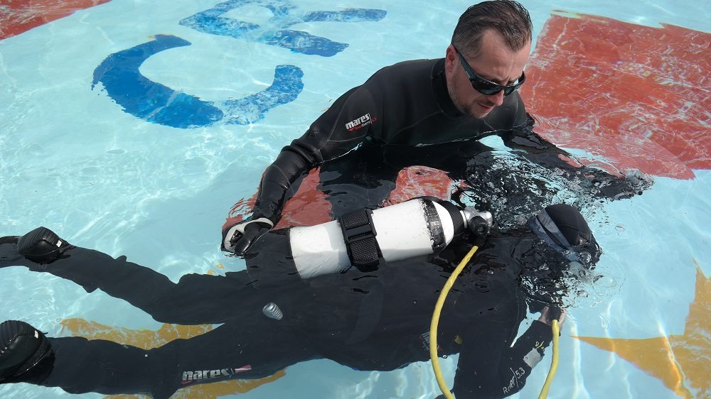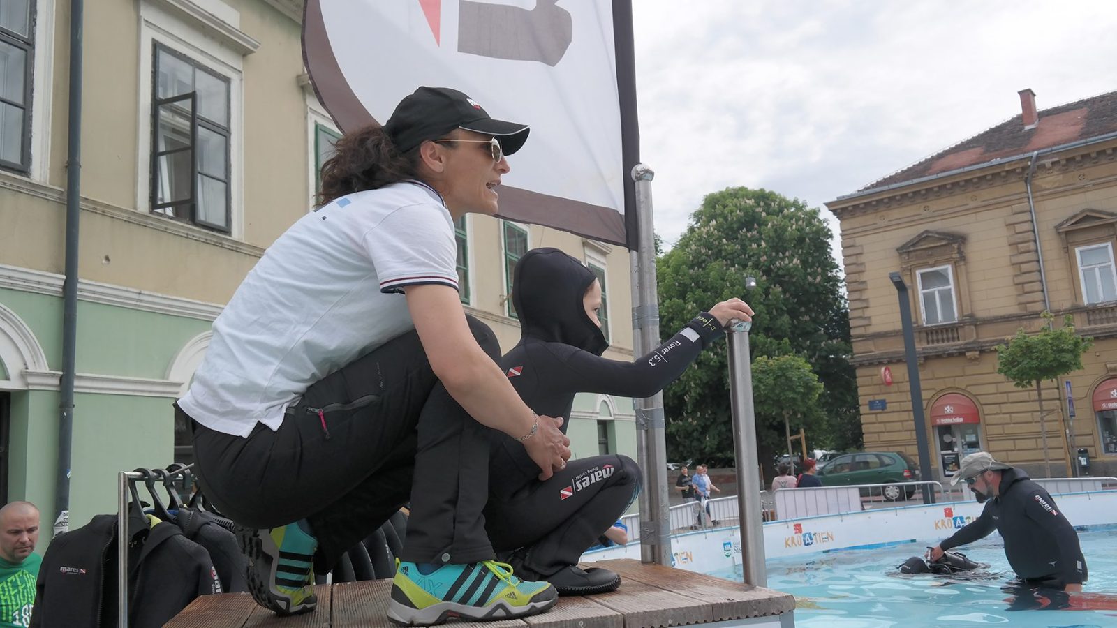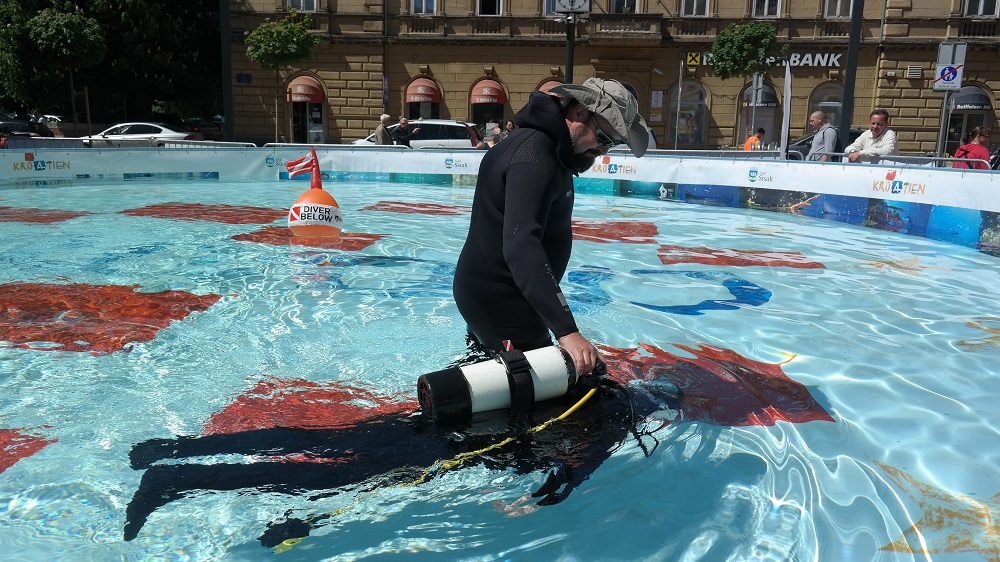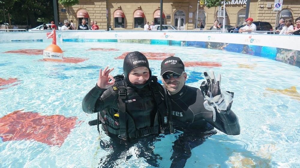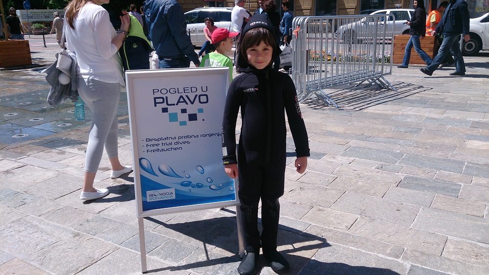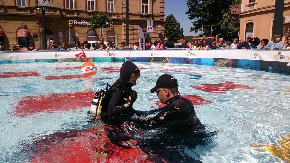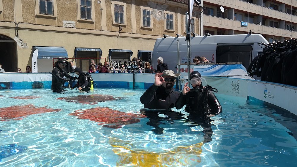 U 10-metarskom bazenu projekta “Pogled u plavo” svi posjetitelji manifestacije imali su priliku besplatno zaroniti s punom ronilačkom opremom i osjetiti ljepote, čari i vještine ronjenja te po prvi put disati pod vodom i upoznati se s ronilačkom opremom. Za sigurnost mladih ronilaca početnika tijekom dva dana pobrinuli su se ronioci i instruktori ronjenja ronilačkog kluba Sisak i ronioci Nemo Adria Rescue Teama koji su ujedno i članovi Specijalističke ronilačke postrojbe Grada Zagreba za spašavanje iz vode pri Uredu za upravljanje u hitnim situacijama. “Drago mi je da smo uspjeli “Pogled u plavo” dovesti u Sisak. Siščani su inače veliki ljubitelji svih vodenih spotova budući da je Sisak grad na tri rijeke. Imamo i zatvoreni olimpijski bazen, a od sljedećeg tjedna i otvoreni, ali ovo je ipak posebno iskustvo. Drago mi je što se “Pogled u plavo” povezao s ekipom iz našeg ronilačkog kluba koji ima dugogodišnju tradiciju i posebno mi je drago što imamo priliku u pješačkoj zoni koja je zaživjela prije nekoliko mjeseci prezentirati ovako dobar i kvalitetan projekt i omogućiti svim građanima, od najmlađih pa do onih najstarijih, da se iskušaju u ronjenju i možda zavole ronjenje do te mjere da se odluče malo češće time baviti”, rekla je gradonačelnica Grada Siska, Kristina Ikić Baniček.