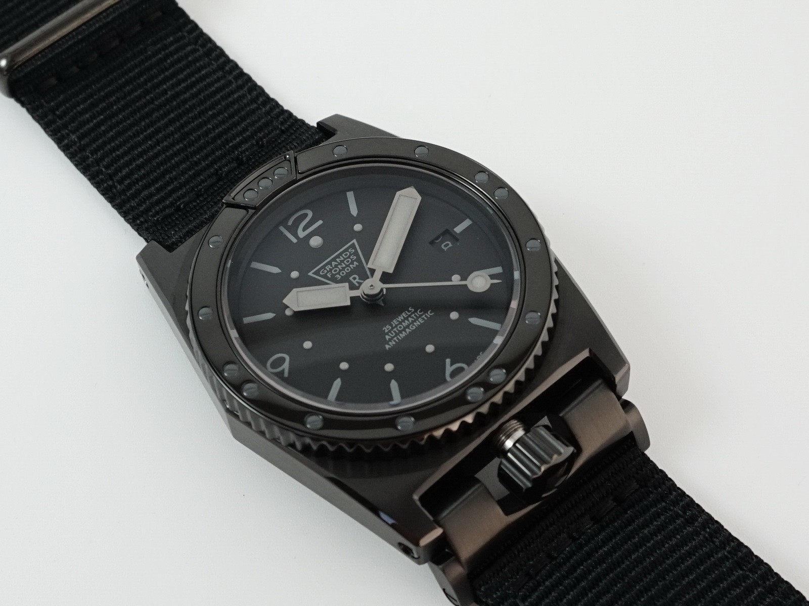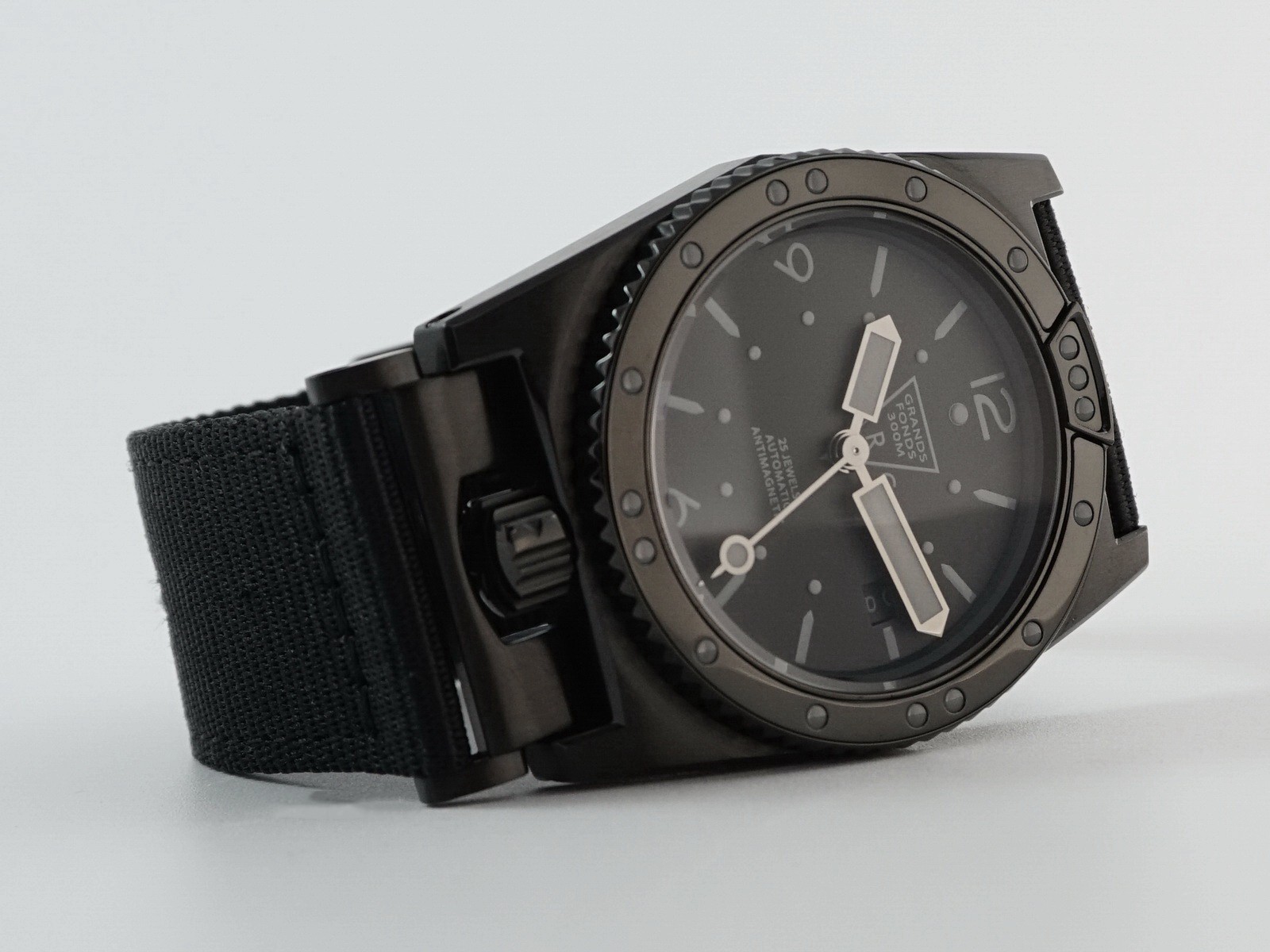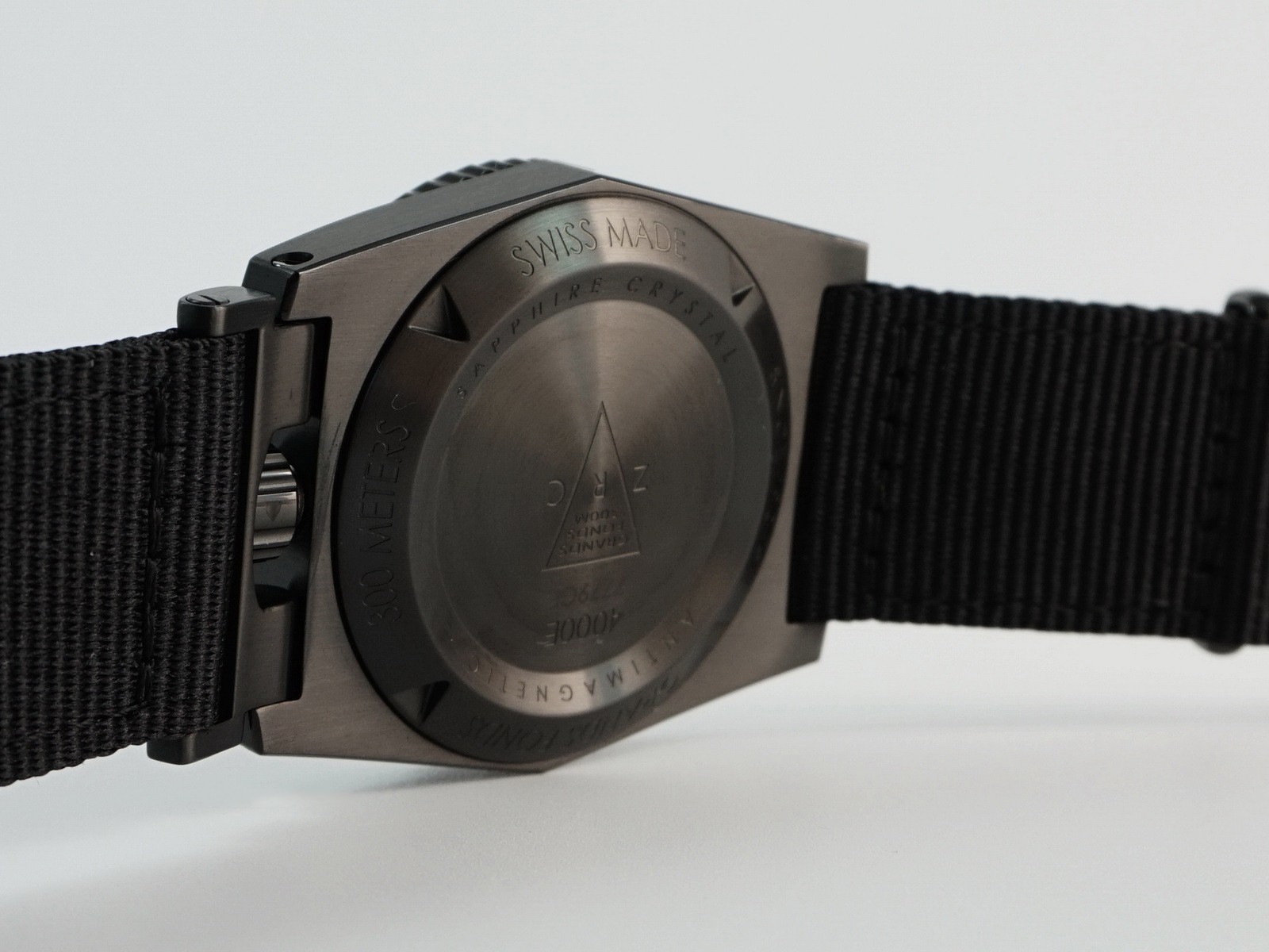 No, ako zanemarimo boju i narukvicu, to je isti ronilački sat kao i reizdanje modela GF 300 iz 2015. godine. Svi elementi dizajnerskog GF potpisa su ovdje: oblik, predimenzionirani marker na sekundarki, masivni trokutasti logotip na poleđini s velikim Z.R.C tekstom… Ipak, kad malo bolje upoznate osobnost Black Phantoma, shvatite da na ruci nosite pravi dragulj. Crna boja ističe “taktičke” namjere i spremnost na suočavanje sa svim izazovima pod vodom, a ne morate se bojati niti vidljivosti na većim dubinama. Naime, iako se to baš i ne vidi, oznake na ključnim mjestima premazane su premazom koji jamči odličnu čitljivost i u mraku. Čelično kućište s crnim premazom odlično se odupire grebanju, a staklo je safirno. Mehanizam koji ga pokreće jedan je od najpouzdanijih švicarskih samonavijajućih mehanizama (ETA 2824-2) i ima zalihu snage od oko 38 sati. Ronilački prsten ima 60 mogućih pozicija, a zanimljiv je i koristan sustav koji mu omogućava čišćenje slatkom vodom. Naime, tako je izveden da nakon ronjenja samo uronite sat u slatku vodu i spriječit ćete kristaliće soli da zaostanu u zupcima mehanizma ronilačkog prstena. Neobičan smještaj krune također ima i svoju dodatnu funkciju, a to je sprečavanje uranjanja dok kruna nije potpuno zavijena. Ako niste krunu postavili u zatvoreni položaj, ne možete narukvicu prilagoditi i normalno staviti sat na ruku pa tako ni zaroniti s njim. Inače, narukvica je najlonska (NATO), ali također specifična. NATO narukvice obično se provlače ispod poleđine sata, a u slučaju Black Phantoma montiraju se kao i ostale narukvice tako da ne povećavaju debljinu sata dok je na ruci. Vodootpornost je zajamčena do 300 metara dubine.